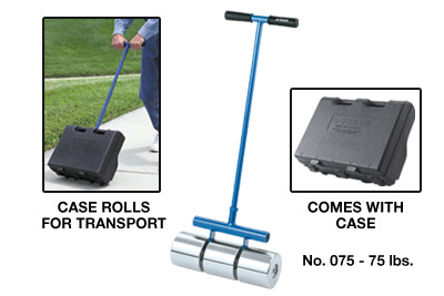 This 75 lb. roller has an all-steel frame and zinc-plated roller sections for long term performance. The roller sections have smooth surfaces and rounded corners to reduce scratching and indentation of the vinyl. The outer sections are counterbored to provide recesses for the axle fasteners and prevent damage to walls. The three sections float independently on the axle to compensate for subfloor irregularities. Also comes with a protective case with wheels for transporting the roller that eliminates hand-carrying and picking up debris on the sections. Sections diameter: 4 1/2“. Width: 16″. Height: 38”. Net weight: 75 lbs.